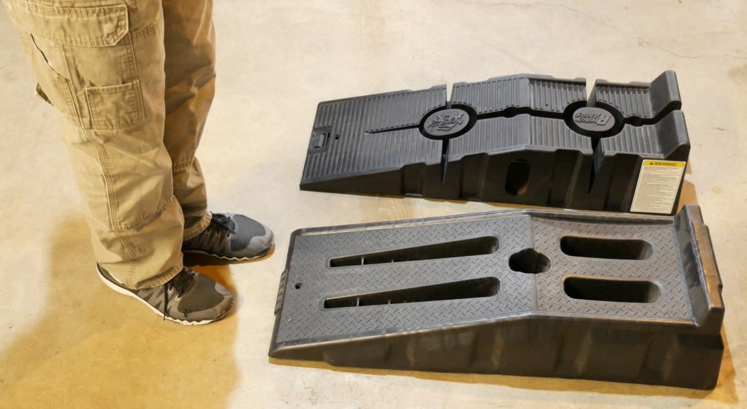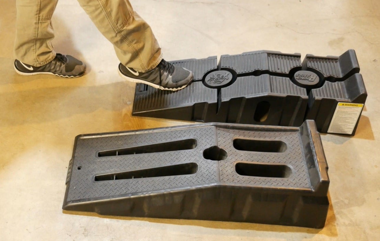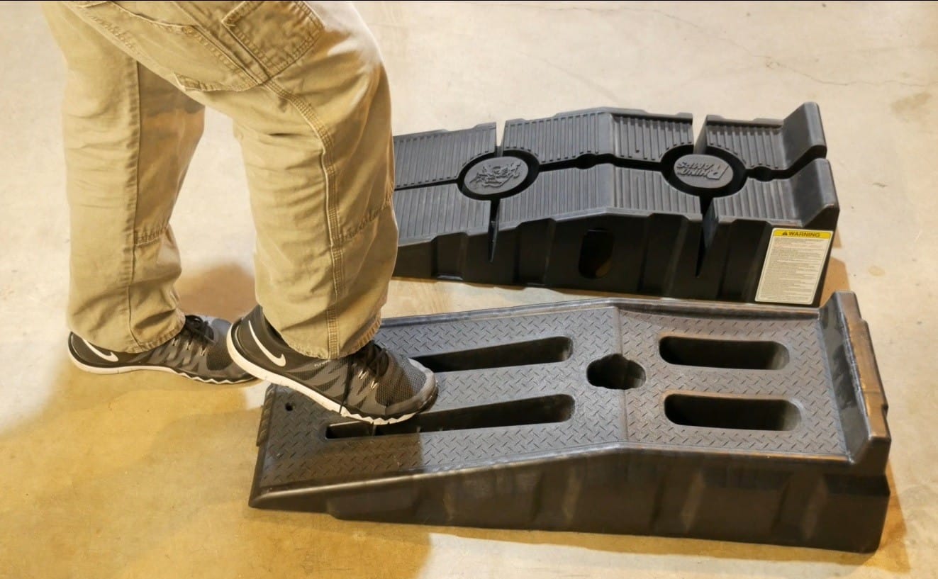 On the DIY Apprentice wrench rating scale, I’m gonna give these ramps a 4 out of 5. The 12,000-lb gross vehicle weight rating for plastic ramps is very impressive. It seems like they put some thought into making these ramps by adding relief cuts to allow the ramps to flex a little bit…and I also like the angle of incline, which is perfect for most vehicles. The one negative that’s stood out obviously is a lack of grip by the foot on the front of the ramps. Overall, these are very reliable ramps, and I’ve used them for the last 3 years without any issues.