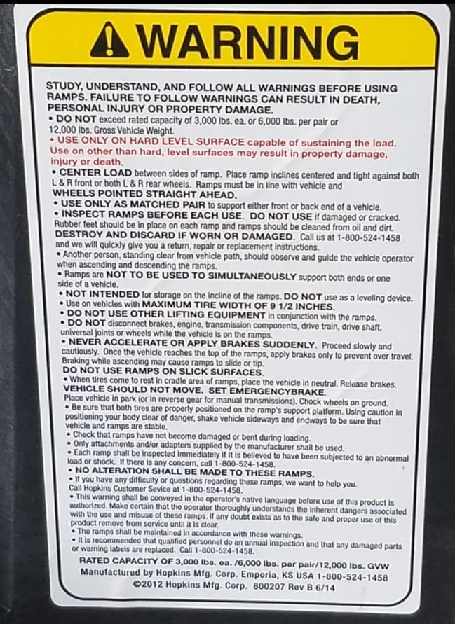 This is the warning label on the side of the ramps, and I would definitely recommend you take some time out and read through this warning label…there’s a lot of good information here, and you want to make sure you’re using the ramps appropriately, especially when you’re talking about working with the vehicle that weighs anywhere from 3000 pounds up. So, definitely make sure you take some time out and read through this so that you use the ramps correctly.