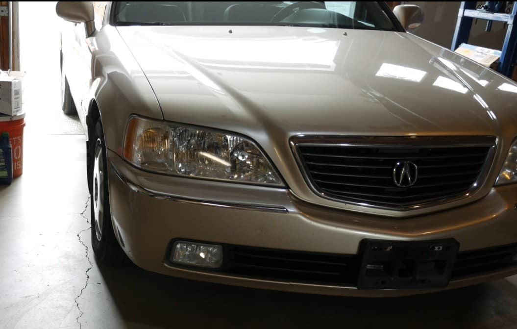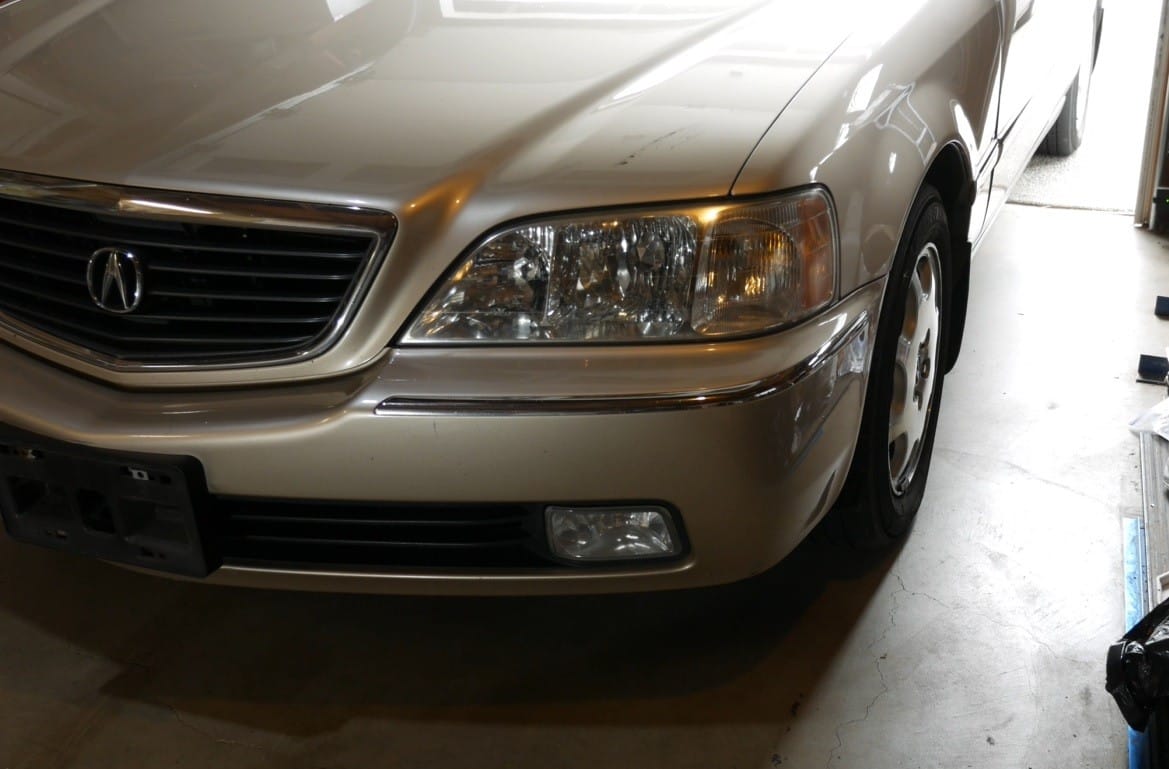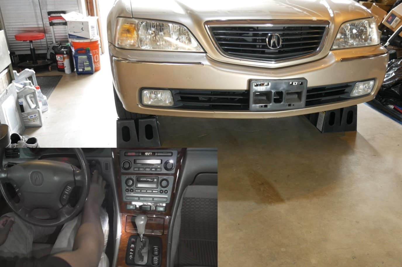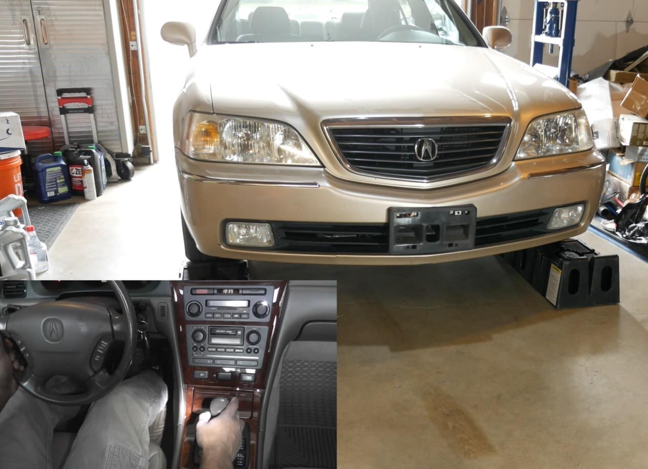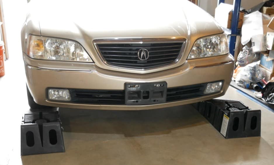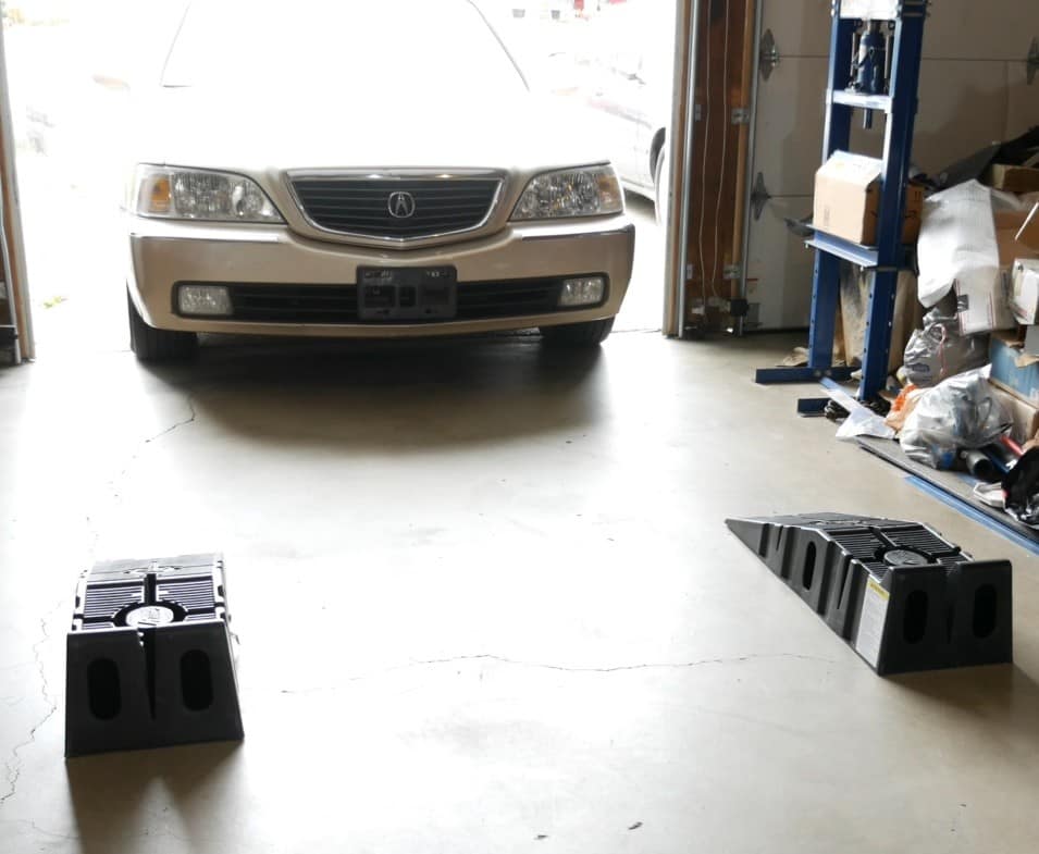 Alright, so let’s do a quick demo of these ramps using my 3800-pound Acura RL as the guinea pig. So what I’ve done here first is positioned the car with the front wheels pointed straight ahead and with plenty of space in front of the car so I don’t run into a wall or run into a cabinet.